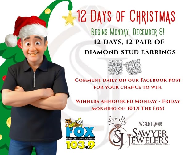 To enter, visit Sawyer Jewelers in Downtown Fenton and register to win in store. Or comment on their daily 12 Days of Christmas posts on the Sawyer Jewelers-Fenton Facebook Page. Then be sure to listen to 103.9 The FOX every day from the 8th through the 19th. If we announce your name, you’ve won a pair of diamond stud earrings! Twelve days, twelve pair of diamond stud earrings!